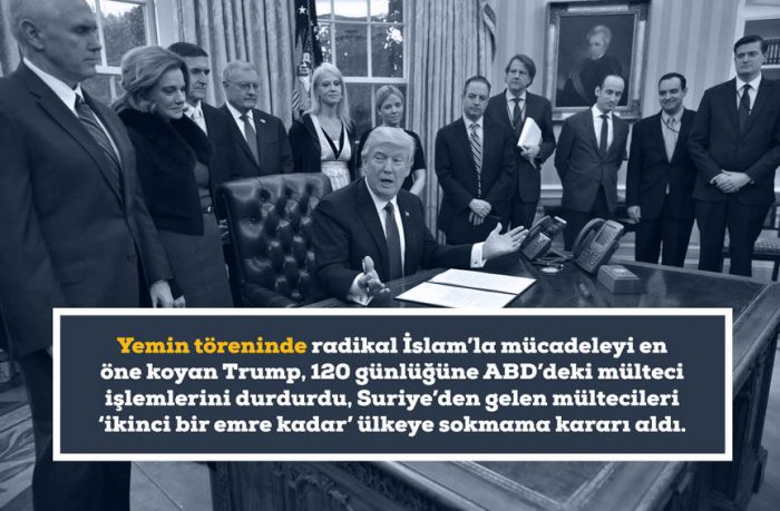 İşte bu Trump’ın ofisteki ilk haftasında imzaladığı idarî kararlar (executive order) beklenen ama bir yandan da absürt uygulamaları içeriyor. Yemin töreninde radikal İslam’la mücadeleyi en öne koyan Trump, 120 günlüğüne ABD’deki mülteci işlemlerini durdurdu, Suriye’den gelen mültecileri ‘ikinci bir emre kadar’ ülkeye sokmama kararı aldı, Irak, Suriye, İran, Libya, Somali, Sudan ve Yemen’den diplomat vizeleri hariç her türlü vizeyi 90 günlüğüne kaldırdı ve mülteci kabullerinde ‘bulundukları ülkede azınlık dinine mensup olanları’ önceleyecek bir uygulama getirdi.
