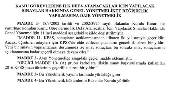 Buna göre, KPSS, sonuçların açıklanmasından itibaren iki yıl, öğretmen adayları için ise KPSS’de elde edilecek puan bir yıl geçerli olacak. Yeni bir sınavın yapılamaması durumunda ise sınav sonuçları, bir sonraki sınav sonuçlarının açıklanmasına kadar geçerli olmaya devam edecek. Geçici maddeye göre ise A grubu kadrolara ilişkin sınav başvurularında kullanılan 2016 KPSS puan türlerinin geçerlilik süresi bir yıl olacak.