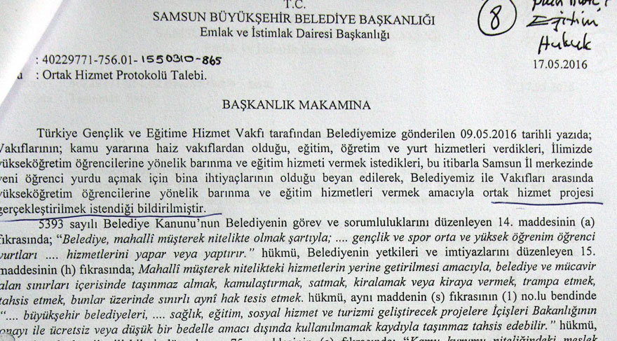 CHP: KÖYLERE SU GÖTÜREMEZKEN, VAKIFLARA PARA AYRILMASINI UYGUN DEĞİLTürkiye Gençlik ve Eğitime Hizmet Vakfı ile Ortak Hizmet Projesi gerçekleştirmek amacıyla, Samsun il merkezinde, yurt olarak kullanılmaya uygun bir binanın 10 yıl süreyle kiralanması, kira sözleşmesini ve Türkiye Gençlik ve Eğitime Hizmet Vakfı ile yapılacak olan Ortak Hizmet Protokolünü imzalamak amacıyla meclise taşınan maddeye karşı çıkan CHPli meclis üyesi Mustafa Tüfek, “Yurt yapma görevi Milli Eğitim Bakanlığı ve Gençlik Spor İl Müdürlüğü’nündür. Bu görev belediyenin görevi değildir. Torba yasayla girdi ama etik değil. Biz daha Samsun’un bazı köylülerine su bile götüremezken bu tarz önemli imkanlarla ekonomisini güçlendiren vakıflara belediye bütçesinden para ayrılmasını ben uygun bulmuyorum” dedi.
