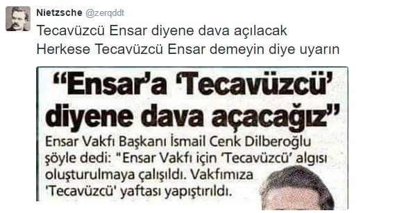 AKP yandaşı Ensar Vakfı’nın Başkanı Cenk Dilberoğlu’nun “Ensar’a tecavüzcü diyene dava açacağız” açıklaması, Twitter’da gündem oldu. “Tecavüzcü Ensar” tabiri Twitter’da Trend Topic listesinde birinci sıraya yükseldi.